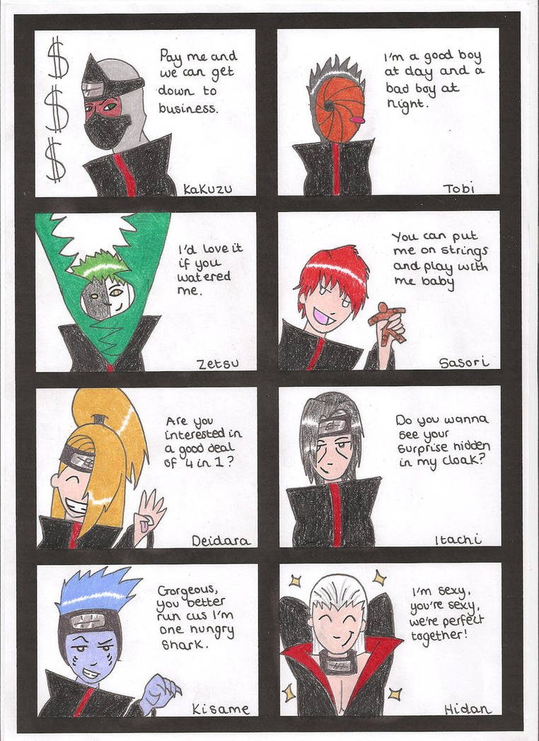 This is a funny picture of most the members Akatsuki members boystrying to get a girl friend and expressing themselves with pick up lines of doom Each of them have a pick up line to suit there personality I enjoyed looking at these and was amused at how funny they wereThere was no Konan but that was probably because she was a girl but it would have been funny to see. This is a funny picture of most the members akatsuki members boystrying to get a girl friend and expressing themselves with pick up lines of doom Each of them have a pick up line to suit there personality I enjoyed looking at these and was amused at how funny they wereThere was no Konan but that was probably because she was a girl but it would have been funny to see.